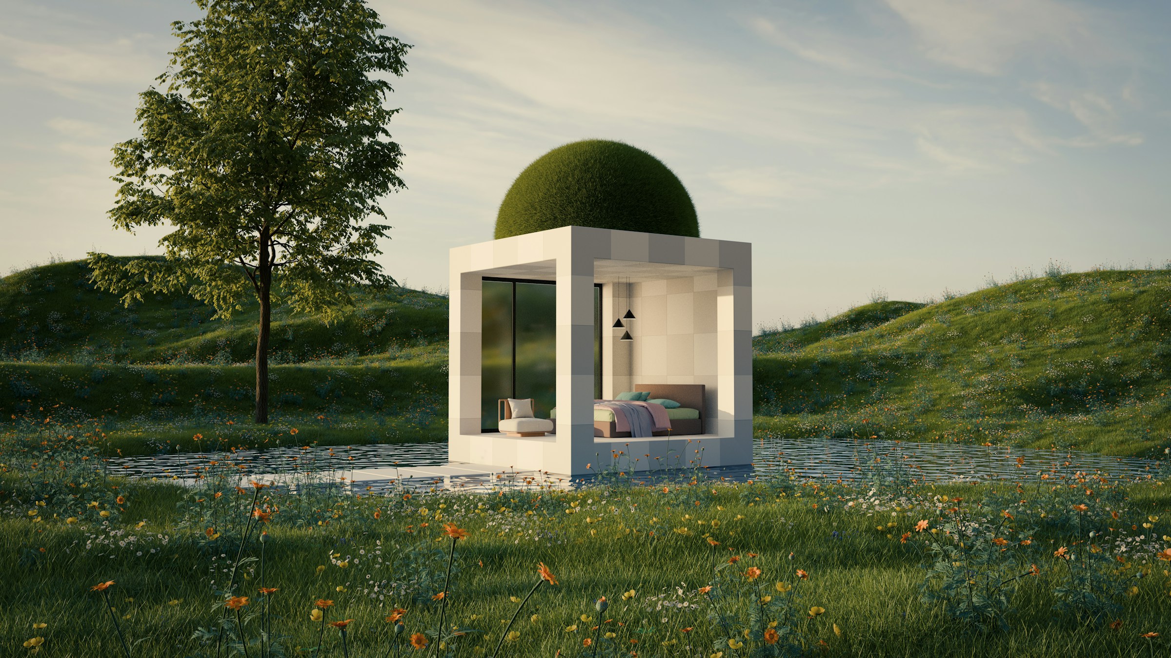 This design explores an ethereal structure perched on a grassy islet, seemingly hovering above water.